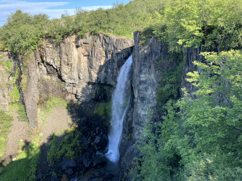 歩きやすい道が続きます。途中にHundafossという滝がありました。遠くからSvartifossを捉えることができます。間近まで来ると圧倒的な迫力です。なんと綺麗な柱状節理。