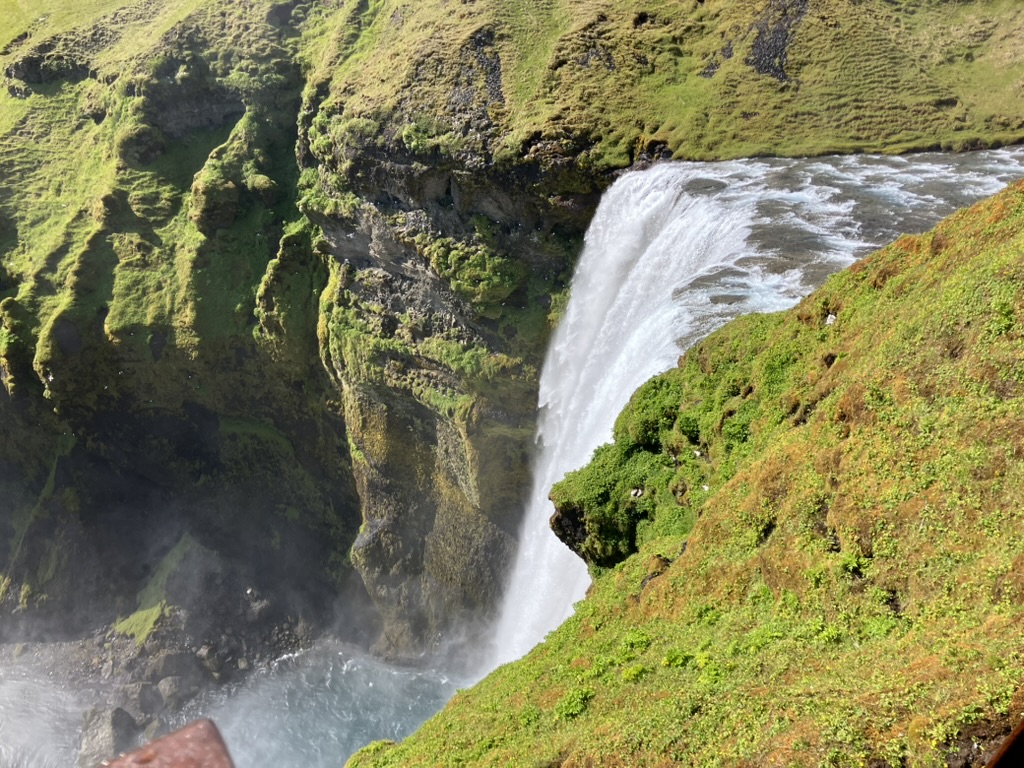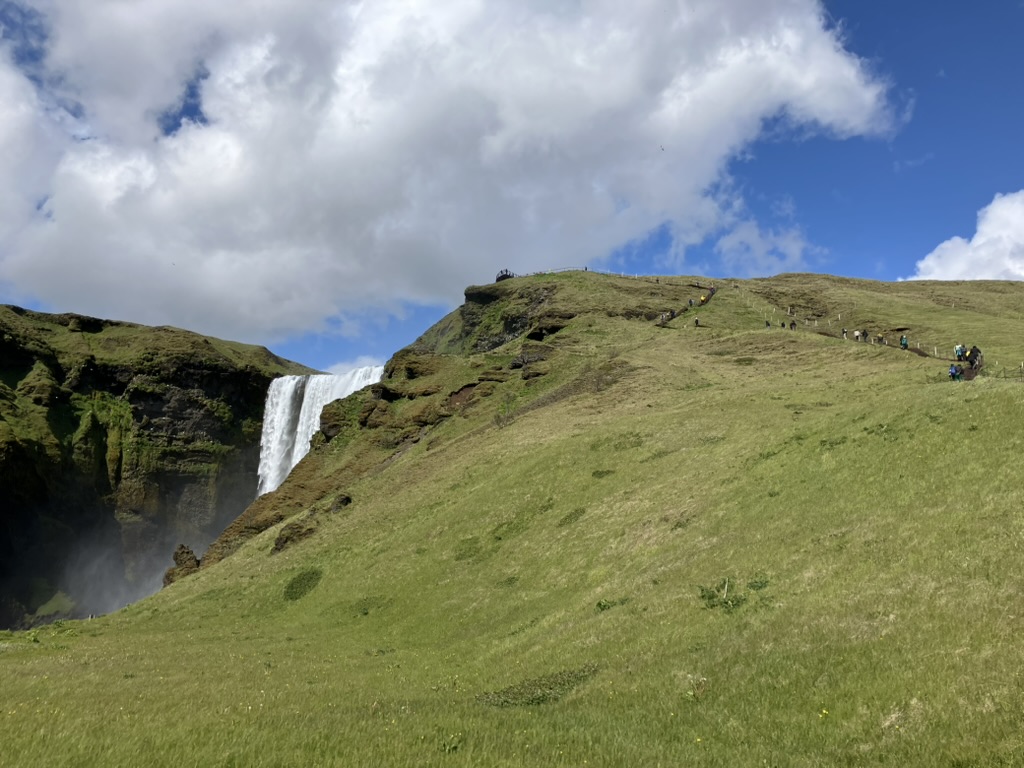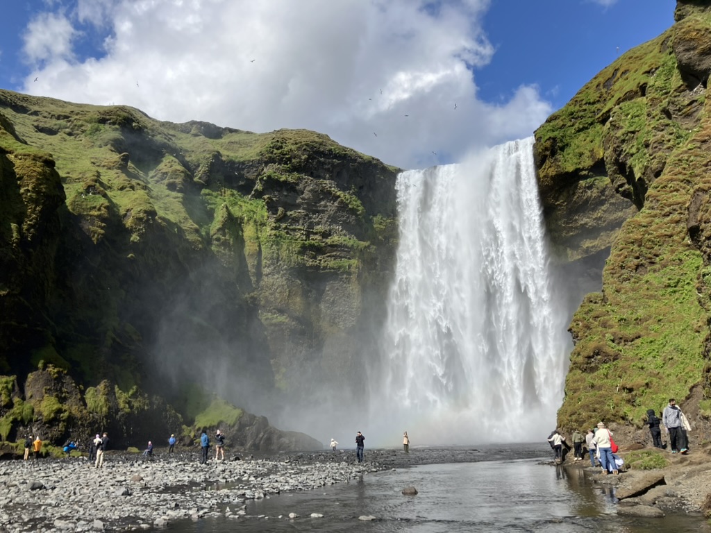 車でさらに走ること30分、スコゥガフォスにやって来ました。幅25m、落差60mはアイスランドで最も大きく、最も美しい滝の一つと言われているそうです。