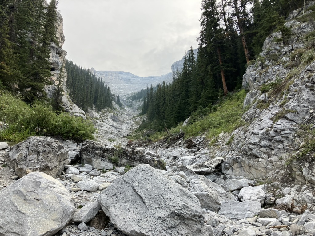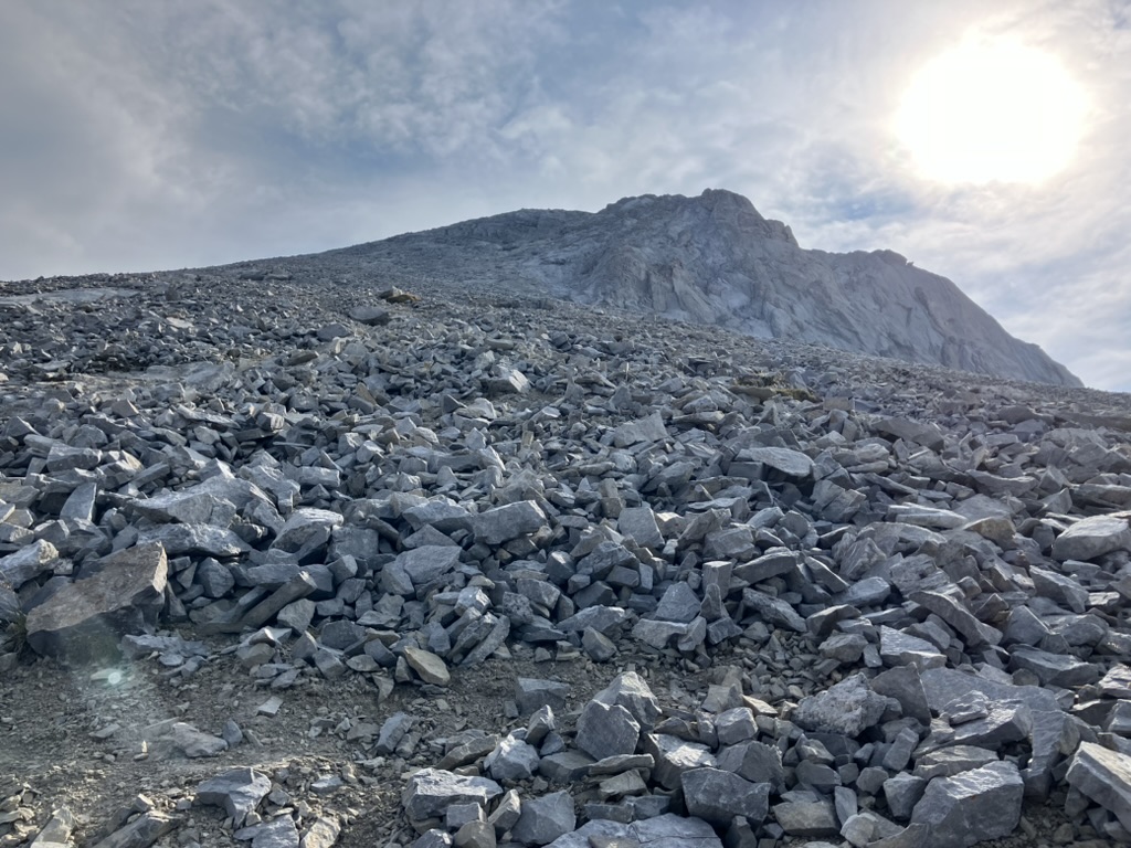 ランドルマウンテンは急斜面で岩がゴロゴロしたガレ場が続きます。